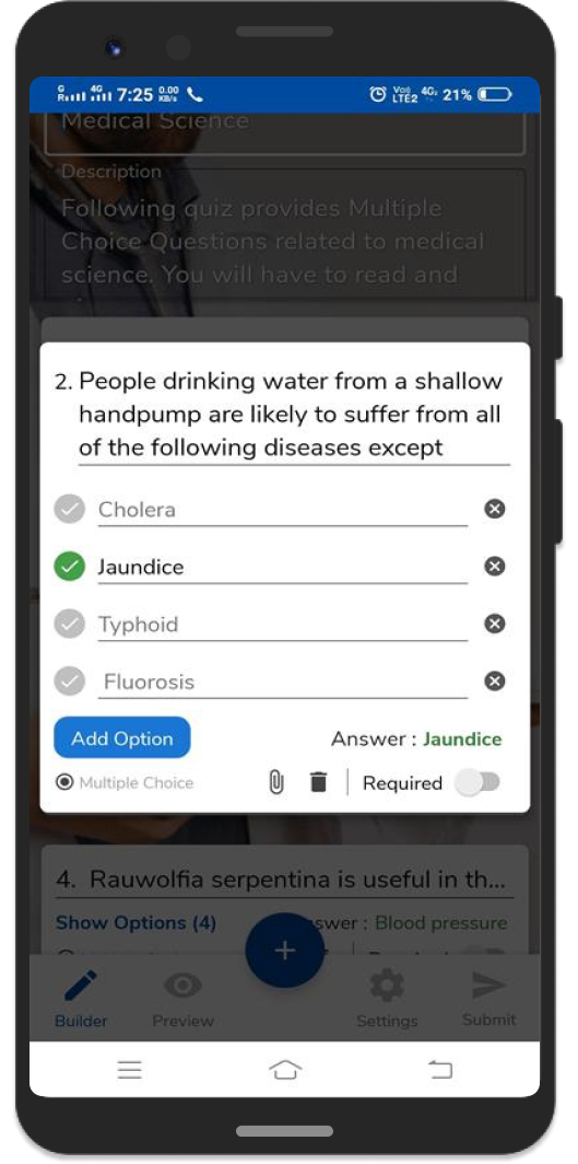 Create quizzes/tests/exams with various types of questions which are commonly used for conducting quizzes. In our quiz builder you can control your quiz access level to the respondents like whether they can view their test results or not, are they allowed to make multiple attempts or not, whether questions of your quiz gets shuffled or not.